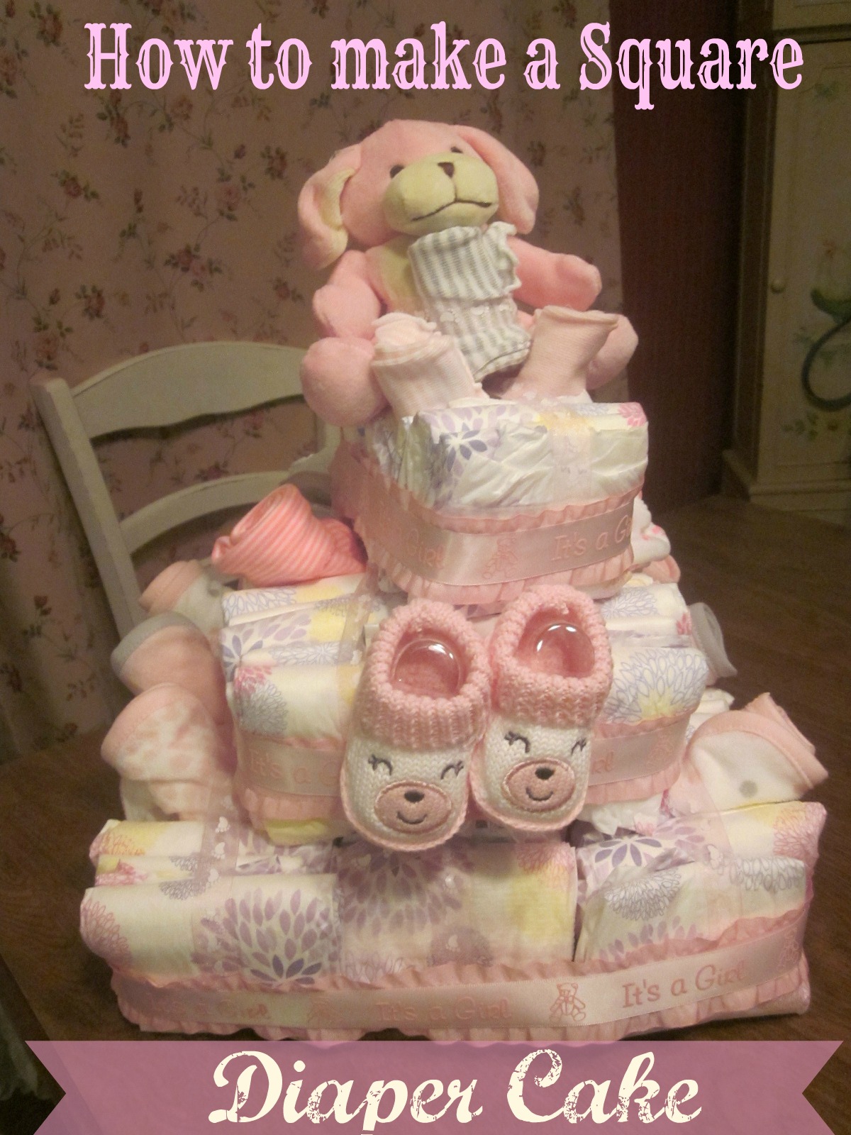 Typical round diaper cakes have each diaper wrapped and then rubber banded- a pain for both the one creating and receiving the cake. A square diaper cake has the diapers folded and then you stack them and tie them together.
